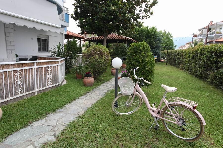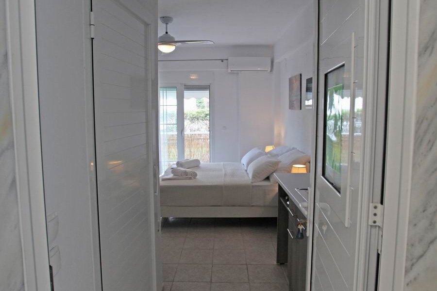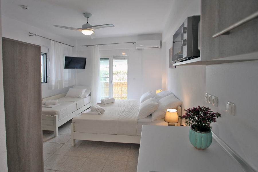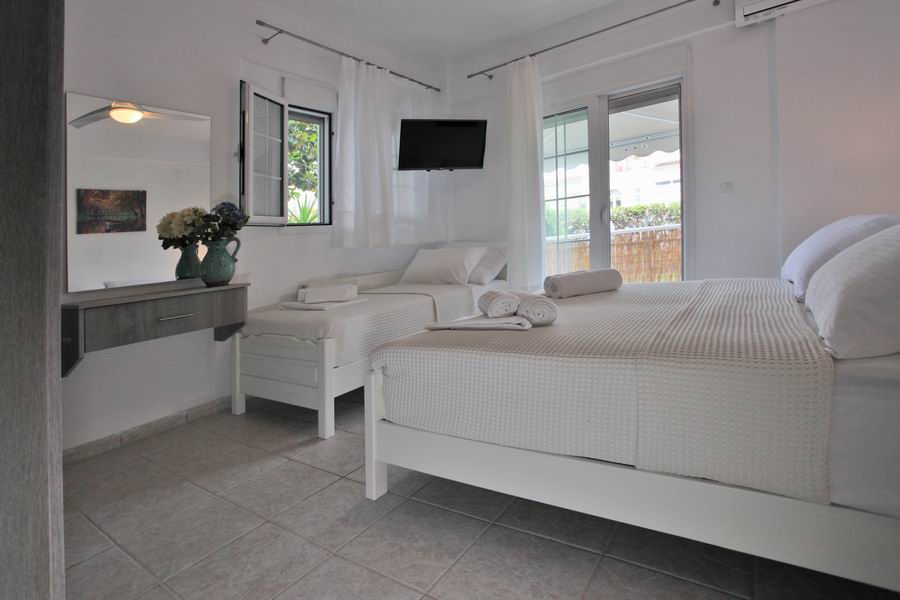 Tři pohodlná lůžka s pěnovými matracemi 80 cm šíře je možno doplnit o přistýlku, plochá TV, trezor, klimatizace s antibakteriální složkou s topným tělesem i pro možné vytápění v chladných měsících, samostatná koupelna s vanou a WC, elektrické zásuvky odpovídající koncovkám českých spotřebičů. Lůžkoviny a ručníky jsou součástí krátkodobého pronájmu.