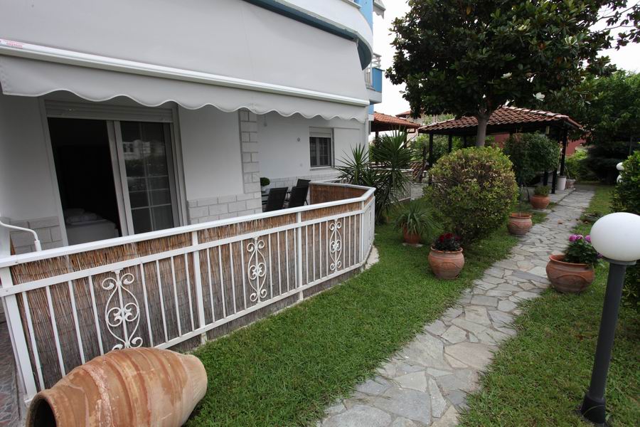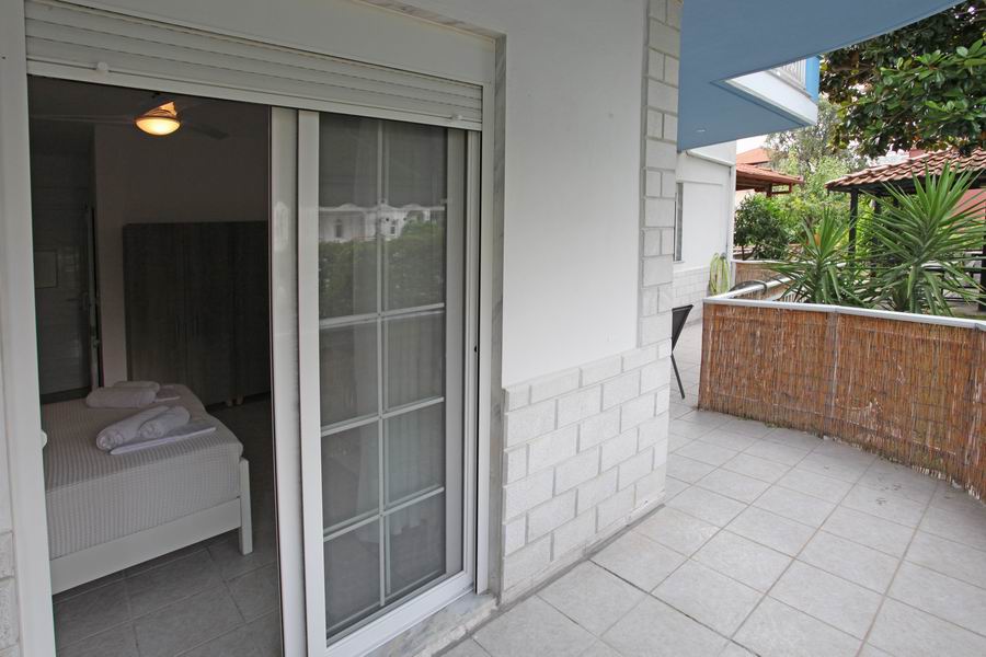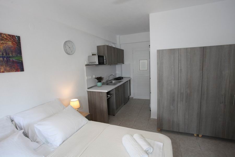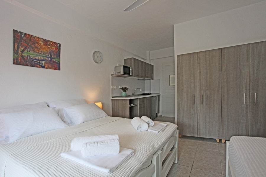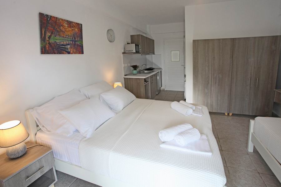 Tři pohodlná lůžka s pěnovými matracemi 80 cm šíře je možno doplnit o přistýlku, plochá TV, trezor, klimatizace s antibakteriální složkou s topným tělesem i pro možné vytápění v chladných měsících, samostatná koupelna s vanou a WC, elektrické zásuvky odpovídající koncovkám českých spotřebičů. Lůžkoviny a ručníky jsou součástí krátkodobého pronájmu.